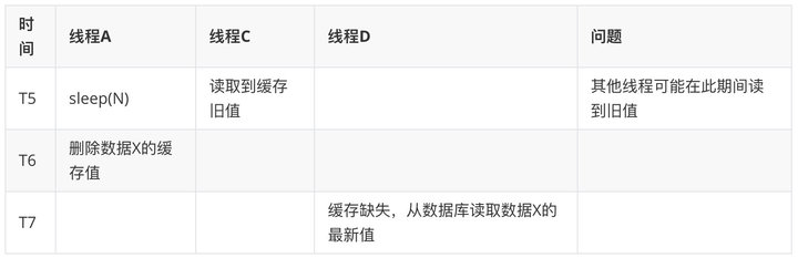 此外,还可以通过延时双删进行保障:在线程 A 更新完数据库值以后,让它先 sleep 一小段时间,确保线程 B 能够先从数据库读取数据,再把缺失的数据写入缓存,然后,线程 A 再进行删除。后续,其它线程读取数据时,发现缓存缺失,会从数据库中读取最新值。